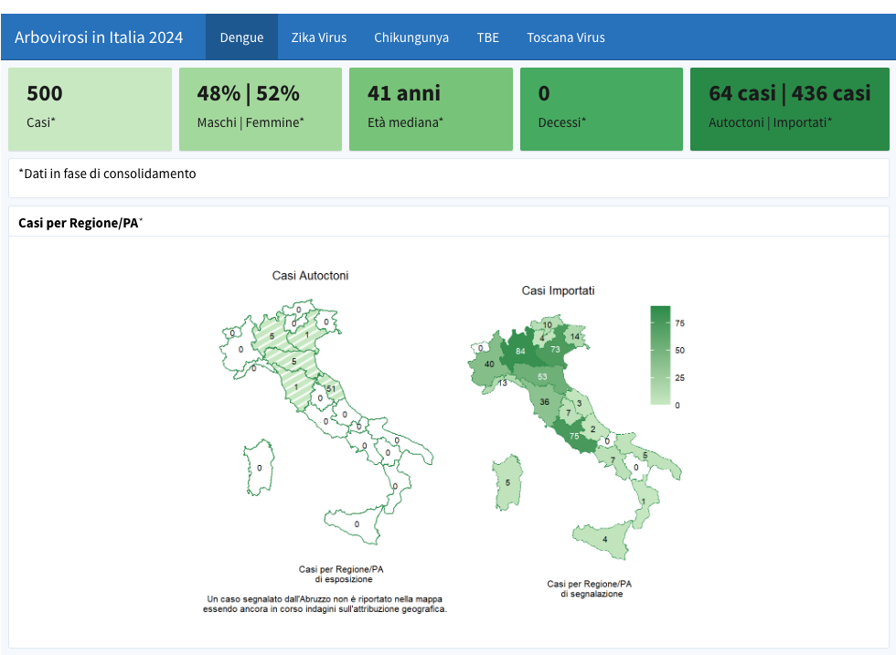 In Italia, come scriveva Start all’inizio del 2024, si era già registrato un insolito aumento dei casi di importazione, che aveva imposto misure di precauzione specialmente negli aeroporti. Ora, in base all’ultimo bollettino settimanale del ministero della Salute, diffuso giovedì 26 settembre, i casi di dengue confermati in Italia dal 1° gennaio al 24 settembre sono stati 500, di cui 436 associati a viaggi all’estero e 64 autoctoni. Non si registrano decessi.