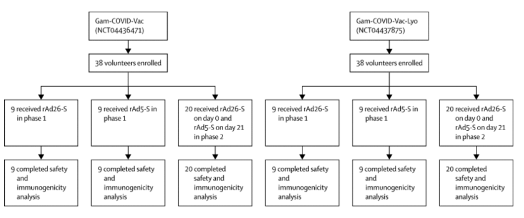 Nella fase 2, un altro gruppo di 20 volontari adulti sani in ciascuno studio ha ricevuto dosi sequenziali di rAd26-S seguite da rAd5-S di una delle due formulazioni.