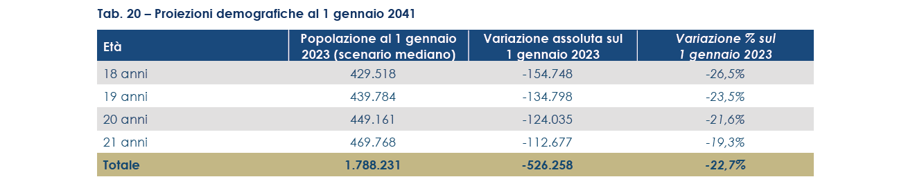 Il calo demografico e i suoi impatti economici sono una piaga che affligge anche l’università italiana. Infatti, secondo il report elaborato dall’Area Studi di Mediobanca, assumendo costante il tasso di passaggio dalla scuola superiore all’università, nel 2041 il minore introito da rette di frequenza per la riduzione degli iscritti è stimabile, in via prudenziale, in circa 500 milioni di euro, per effetto di circa 415mila studenti in meno (-21,2%).