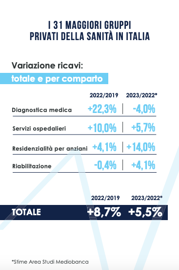 Nell’aggiornamento del report sui maggiori operatori sanitari privati in Italia, l’Area Studi di Mediobanca ha analizzato i principali gruppi con fatturato individuale superiore a 100 milioni di euro e dalle prime evidenze per il 2023 è emerso che per gli operatori privati esaminati si prevede “una crescita aggregata del giro d’affari del +5,5%”.