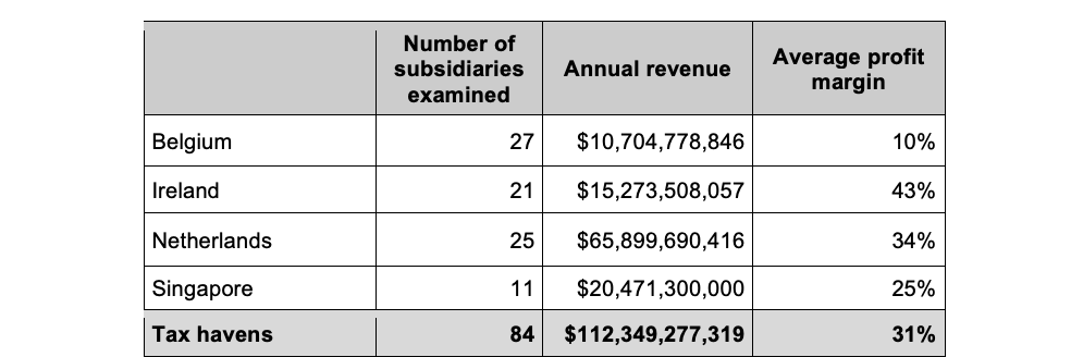 “In quattro Paesi che applicano aliquote fiscali basse o nulle, queste aziende hanno registrato margini di profitto alle stelle, pari al 31%”. In particolare, i quattro Paesi indicati sono: Belgio, Irlanda, Paesi Bassi e Singapore.