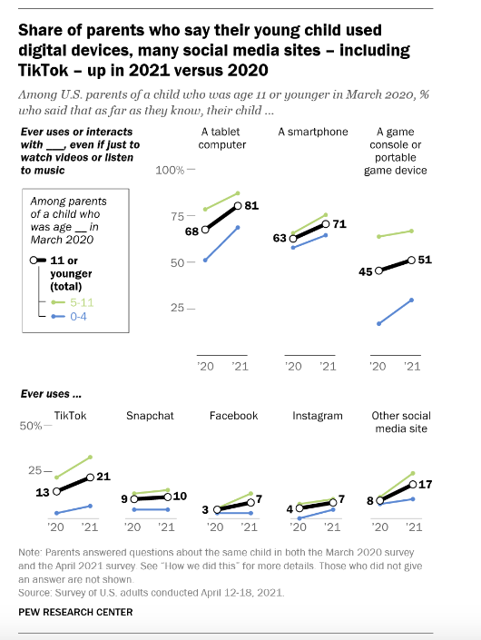 Secondo quanto riferito dai genitori, il social più usato dai figli con meno di 11 anni è stato TikTok: ad aprile 2021 veniva usato dal 21% dei bambini, contro il 13% del 2020. Anche l’uso degli altri social è comunque quasi raddoppiato tra il 2020 e il 2021, passando dall’8% al 17%.