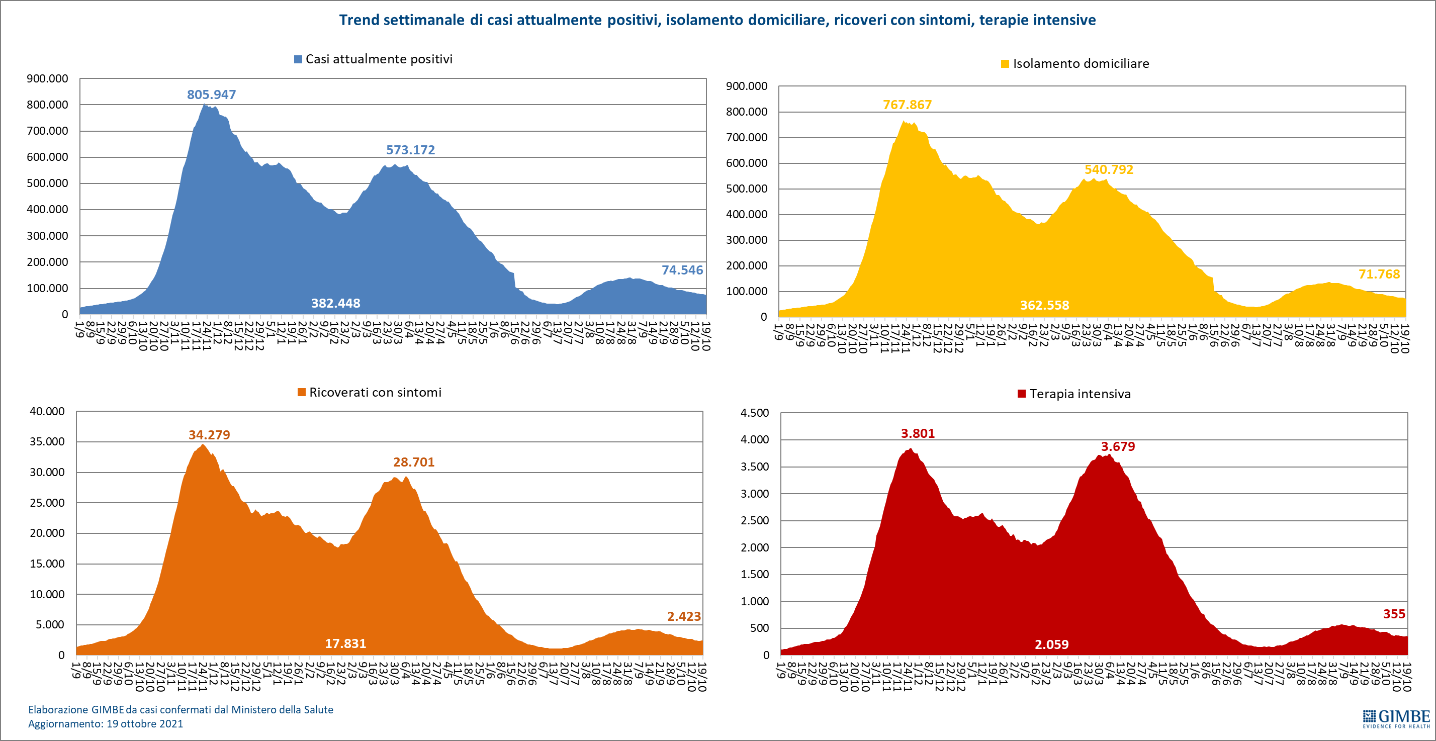 Il monitoraggio indipendente della Fondazione Gimbe rileva nella settimana 13-19 ottobre 2021, rispetto alla precedente, una lieve diminuzione dei nuovi casi (17.870 vs 18.209) (figura 1) e una sostanziale stabilità dei decessi (271 vs 266) (figura 2). In calo gli attualmente positivi (74.546 vs 82.546), le persone in isolamento domiciliare (71.768 vs 79.511), i ricoveri con sintomi (2.423 vs 2.665) e le terapie intensive (355 vs 370) (figura 3). In dettaglio, rispetto alla settimana precedente, si registrano le seguenti variazioni: