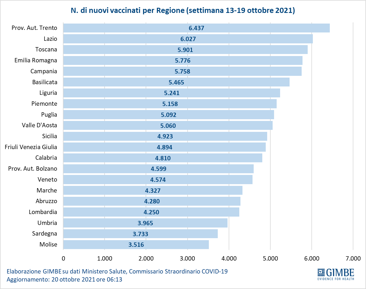 Analizzando il numero di nuovi vaccinati della settimana 13-19 ottobre standardizzato per 100.000 soggetti che non hanno ricevuto nemmeno una dose vaccino al 12 ottobre, si rilevano notevoli differenze regionali: dai 6.437 della P.A. di Trento ai 3.516 del Molise (figura 12).
