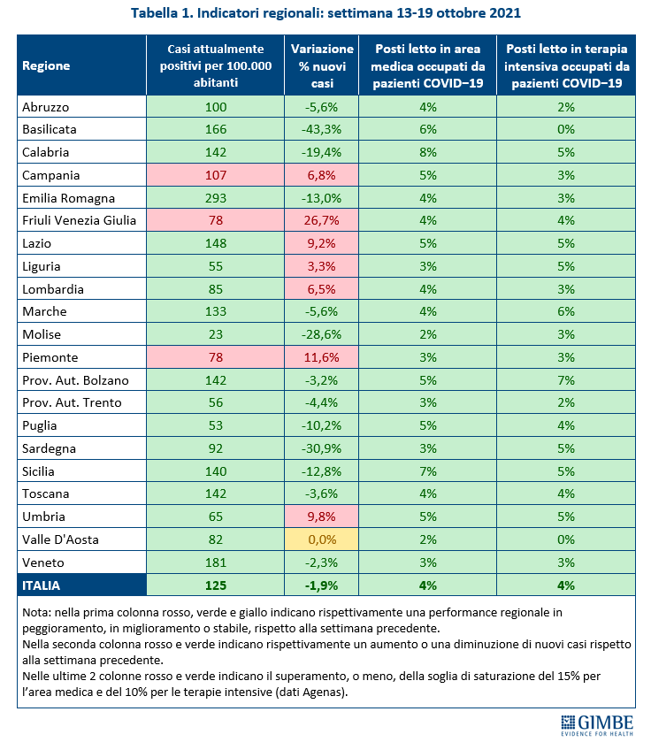 Effetti green pass. Il numero dei tamponi antigenici rapidi ha registrato una netta impennata, aumentando del 78,5% in una settimana: la media mobile a 7 giorni è salita da 173.235 del 13 ottobre a 309.297 il 19 ottobre; complessivamente, nell’ultima settimana sono stati effettuati 2.151.081 tamponi antigenici rapidi. La media mobile a 7 giorni dei nuovi vaccinati rimane, invece, sostanzialmente stabile: da 57.275 del 13 ottobre a 58.201 del 19 ottobre; complessivamente nell’ultima settimana sono state vaccinate 407.404 nuove persone (+4,7%). «Nell’interpretare gli effetti del green pass su tamponi e nuovi vaccinati – spiega Cartabellotta – bisogna tenere conto che ogni persona non vaccinata può arrivare a sottoporsi sino a 3 tamponi a settimana, mentre per aumentare la copertura vaccinale è sufficiente che il numero di nuovi vaccinati non tenda allo zero».