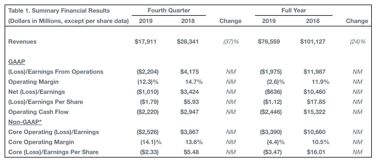 Risultati, quelli appena elencati, che riflettono un quarto trimestre particolarmente negativo, con ricavi in calo del 37% a 17,9 miliardi di dollari e una perdita di 1,01 miliardi di dollari (contro i +3,42 miliardi del quarto trimestre 2018).