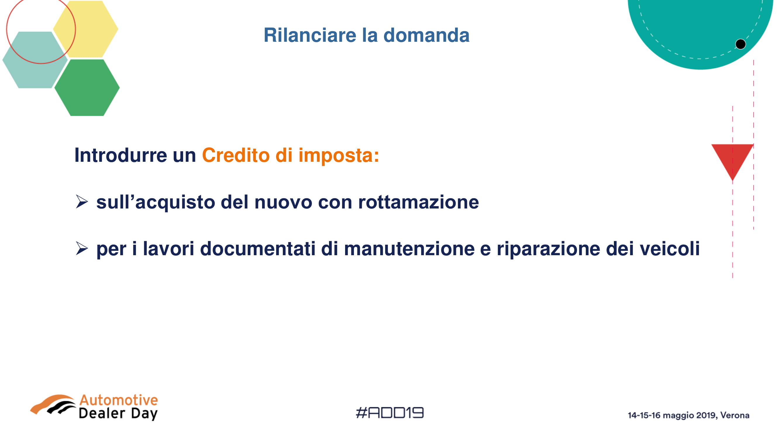 Inoltre, secondo De Stefani Cosentino, “la duplicazione d’imposta che subiscono i Dealer quando acquistano un’autovettura usata da un soggetto che ha detratto l’IVA parzialmente (il 40%) non è accettabile e penalizza ingiustamente le nostre aziende. È auspicabile un intervento complessivo sulla fiscalità che miri ad allineare progressivamente l’Italia agli altri Paesi UE e preveda l’introduzione della formula, già positivamente sperimentata in altri ambiti, del credito di imposta sull’acquisto del nuovo abbinato alla rottamazione di autovetture vecchie e per i lavori documentati di manutenzione e riparazione, al fine di favorire la sostituzione dei veicoli più inquinanti, l’emersione della base imponibile connessa alle attività del post-vendita ed un parco circolante con sistemi di sicurezza attiva e passiva adeguati”.