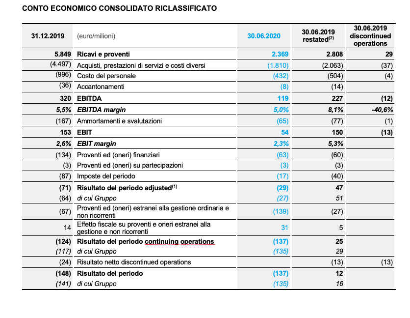 - Ricavi al 30 giugno 2020 pari ad euro 2.369 milioni (euro 2.808 milioni al 30 giugno 2019), in flessione del 15,6% che risentono della perdita di valore della produzione nel semestre per circa euro 790 milioni