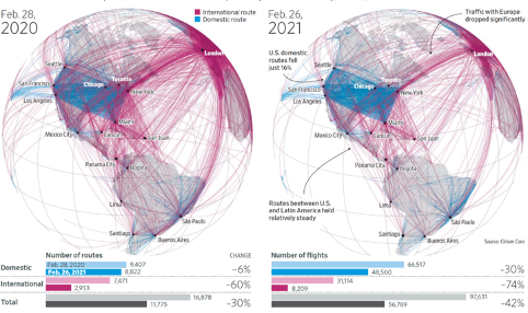 Tenete in mente queste due date: 26 febbraio 2021 e 28 febbraio 2020. Il Wall Street Journal ha scattato due istantanee del traffico aereo in quei due giorni e le ha confrontate, con un esito abbastanza prevedibile ma comunque impressionante nei numeri. Un crollo di dimensioni epocali. Con un piccolo dettaglio finale non insignificante: la Cina si è già ampiamente risollevata.