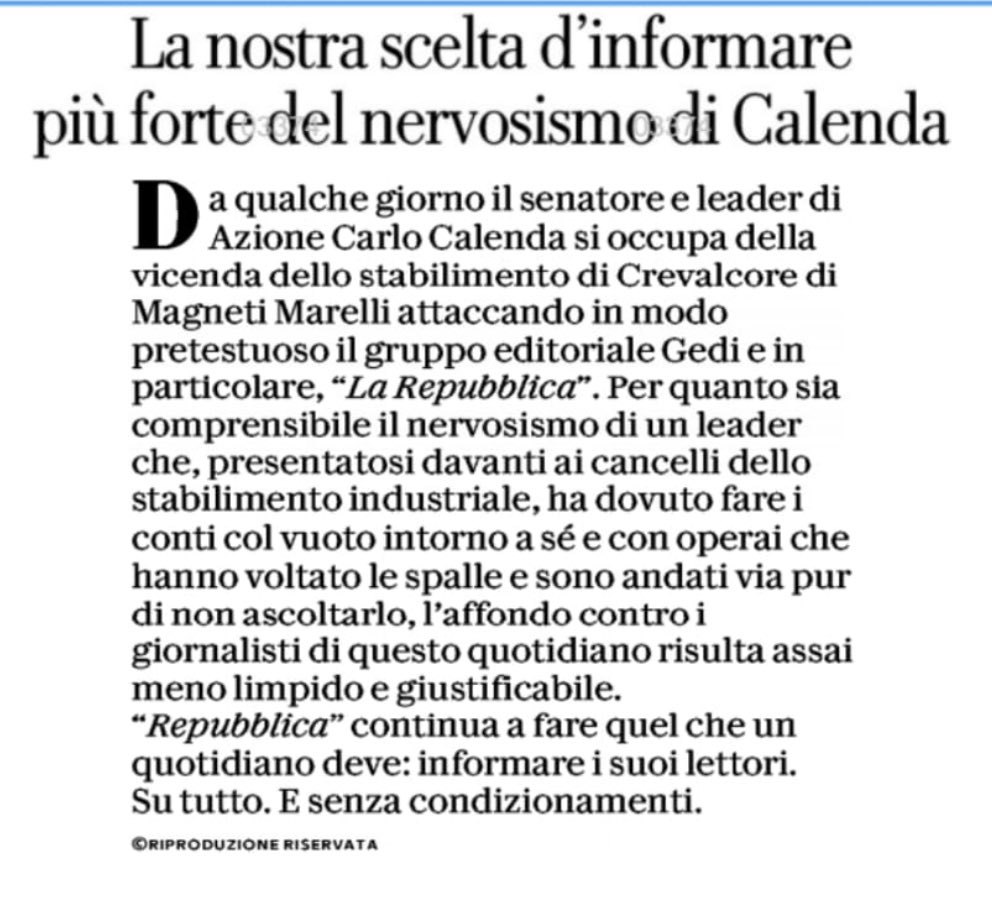 Ma torniamo alla chiusura dell’impianto Marelli a Crevalcore che ha avuto una eco politica solo grazie agli interventi del leader di Azione Carlo Calenda, che ha accusato la Cgil e il segretario Maurizio Landini di non aver fatto abbastanza. «Landini cerca un posto in politica e ha bisogno del sostegno di Repubblica che è degli Elkann».