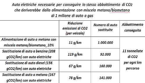 Volendo prendere atto della realtà, e a partire dal citato lavoro Road Map della Mobilità Sostenibile, risulta che un’auto a metano di classe B ha emissioni reali Well-To-Wheel (“dal pozzo alla ruota”) di circa 167 g/km di CO2, che si ridurrebbero a 156 immettendo nella rete una quota del 10% di biometano, per il cui processo di produzione e distribuzione si assume una efficienza com-plessiva del 65%. Per contro, con l’attuale mix italiano per la generazione elettrica le emis-sioni imputabili ad un’auto elettrica della stessa classe sono di circa 89 g/km, con una efficacia largamente maggiore.