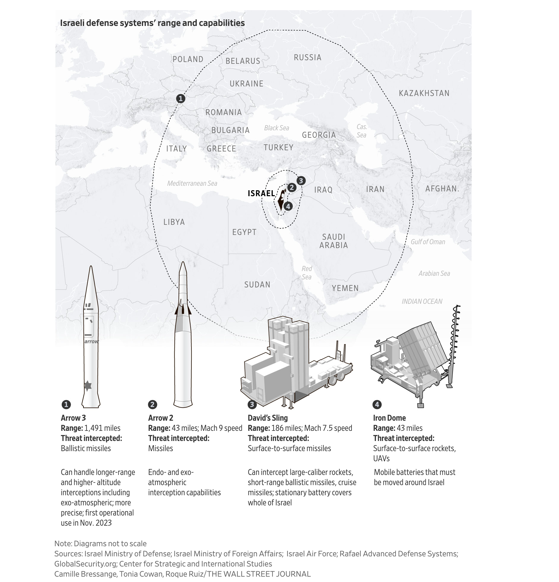 Lo Stato ebraico gestisce sofisticati sistemi di difesa aerea che hanno visto un’azione intensa nell’ultimo anno. Come illustra il Wall Street Journal nel grafico seguente, la contraerea include il sistema di difesa antimissile balistico Arrow 3 sviluppato congiuntamente con gli Stati Uniti e in grado di intercettare missili al di fuori dell’atmosfera terrestre. Il sistema David’s Sling è una batteria stazionaria terrestre in grado di intercettare missili terra-terra, aerei, droni e altri proiettili a una distanza di circa 200 km, che comprende l’intero territorio di Israele. Le batterie mobili del sistema Iron Dome possono intercettare razzi terra-terra e droni a una distanza di circa 70 km.
