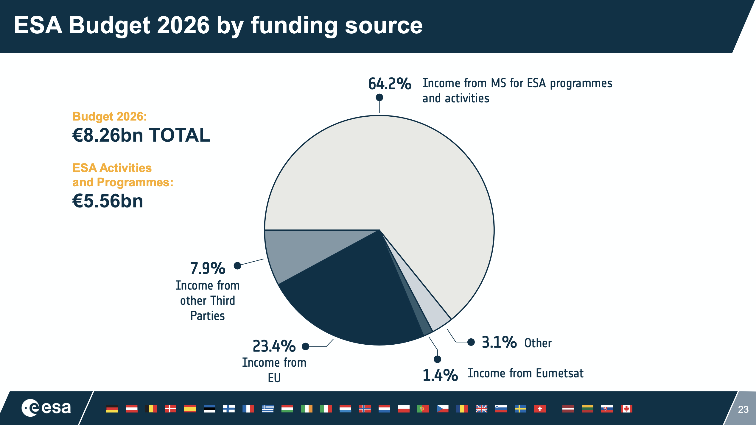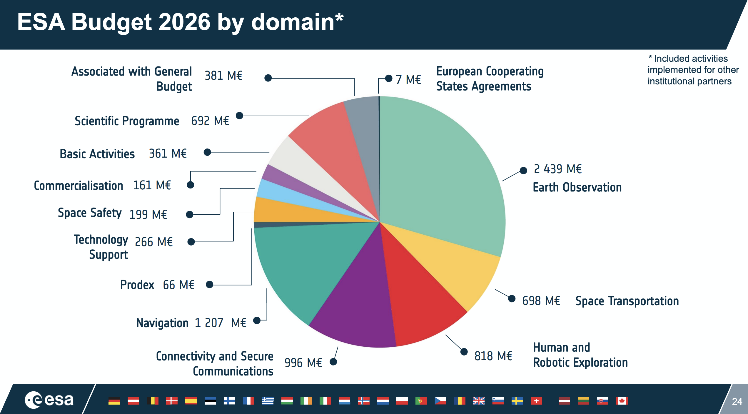 Per sostenere l’aumento delle attività, l’Esa dispone nel 2026 di un budget complessivo di 8,26 miliardi di euro. La fetta più consistente è l’osservazione della Terra, che assorbe circa il 30% delle risorse, pari a 2,4 miliardi di euro. Seguono navigazione con oltre 1,2 miliardi, comunicazioni con 996 milioni ed esplorazione umana e robotica con 818 milioni di euro, trasporto spaziale con 698 milioni di euro.
