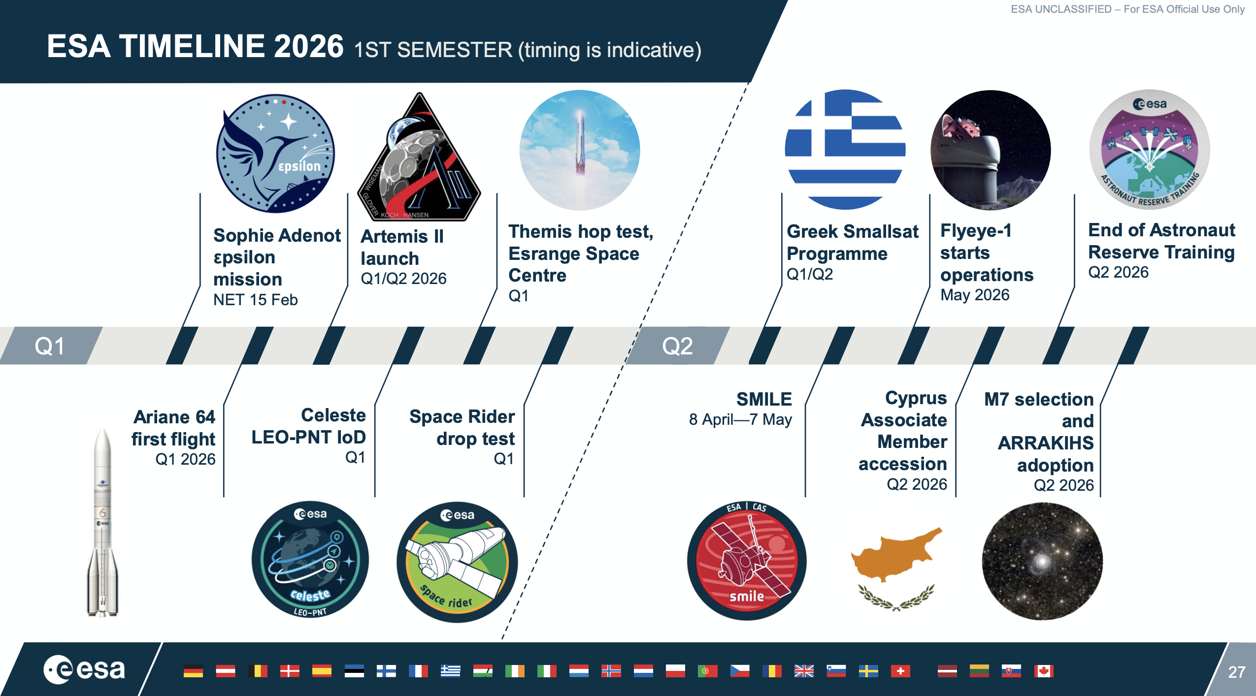 Nel campo dell’esplorazione, l’Esa gestisce 15 missioni operative e 12 in fase di preparazione. Tra i momenti centrali dell’anno vi è l’imminente volo dell’astronauta francese Sophie Adenot verso la Stazione Spaziale Internazionale (Iss), che fa parte dell’equipaggio della missione Crew-12 della Nasa con finestra di lancio dal 15 febbraio. “L’obiettivo primario dei nostri astronauti a bordo della stazione spaziale è davvero quello di far progredire la scienza e la tecnologia”, ha affermato Aschbacher.