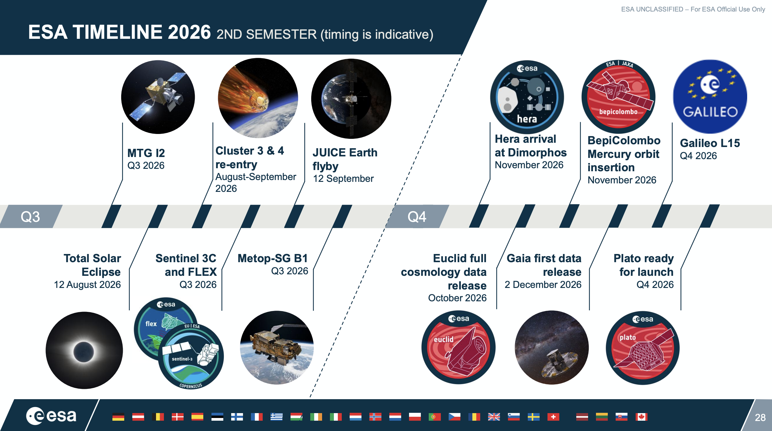 Sempre a novembre 2026 la missione BepiColombo raggiungerà Mercurio ed entrerà in orbita attorno al pianeta. Infine, ad ottobre è previsto il rilascio dei dati delle missioni scientifiche Euclid mentre a dicembre saranno disponibili quelli di Gaia.
