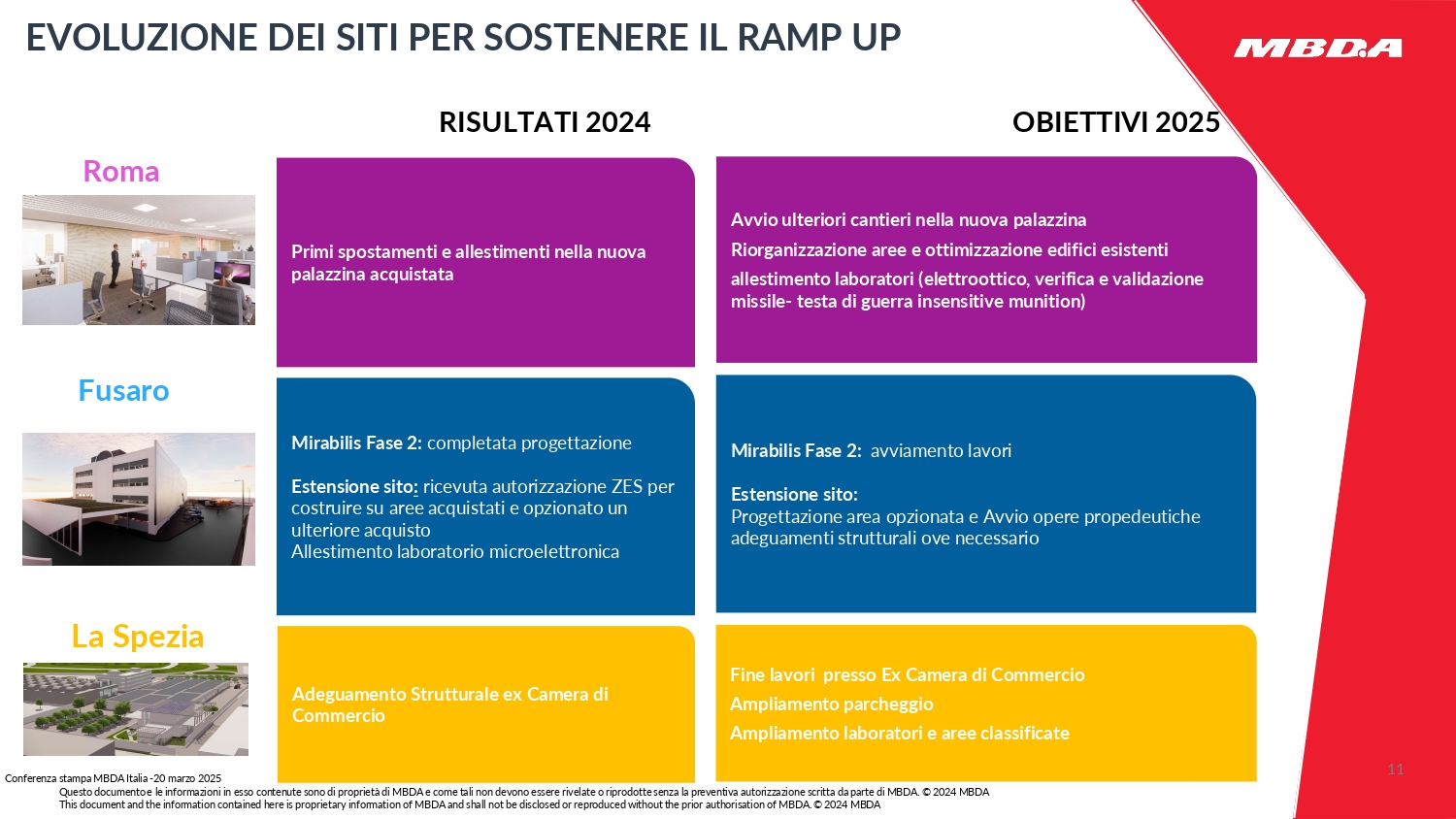 Per supportare tutte queste attività che il 2024 ha visto l’azienda impegnata a realizzare investimenti su tutti e tre i siti. In particolare va ricordato l’acquisto di terreni per la realizzazione di ulteriori spazi e l’allestimento del laboratorio di microelettronica nel sito del Fusaro di Bacoli (NA), nonché l’adeguamento dell’ex Camera di Commercio di La Spezia e i primi spostamenti nella nuova palazzina acquisita per il sito di Roma. Tutte attività necessarie a supportare il ramp up produttivo perseguito e che continuerà nel 2025 quando anche a Roma verranno allestiti dei nuovi laboratori (elettroottico, verifica e validazione missile; testa di guerra insensitive munition), così come a La Spezia per rispondere alla necessità di sviluppare, produrre e testare nuove tecnologie e sistemi.