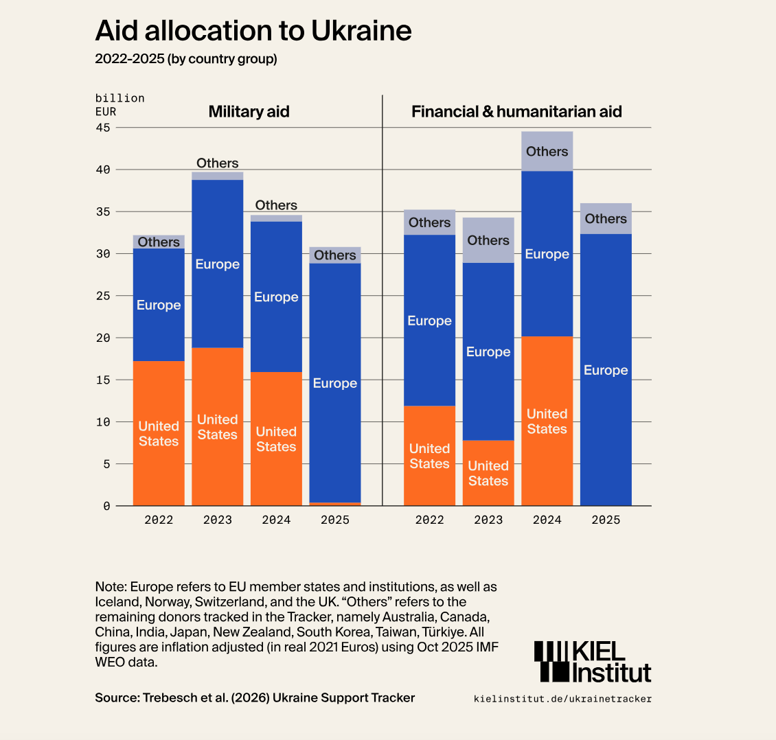 Secondo Christoph Trebesch, responsabile dell’Ukraine Support Tracker, “Il nuovo prestito da 90 miliardi di euro concordato alla fine del 2025 rientra in una tendenza generale. Il crescente fabbisogno di bilancio dell’Ucraina è ora finanziato in gran parte attraverso prestiti e sovvenzioni a livello Ue”.