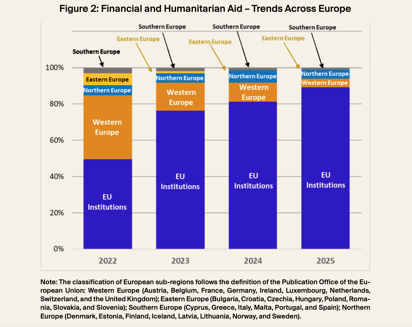Parallelamente all’aumento dei contributi da parte di Europa occidentale e settentrionale, altre aree del continente hanno progressivamente ridotto la loro partecipazione tra il 2022 e il 2025. L’Europa orientale ha visto la propria quota scendere dal 17% nel 2022 ad appena il 2% nel 2025.