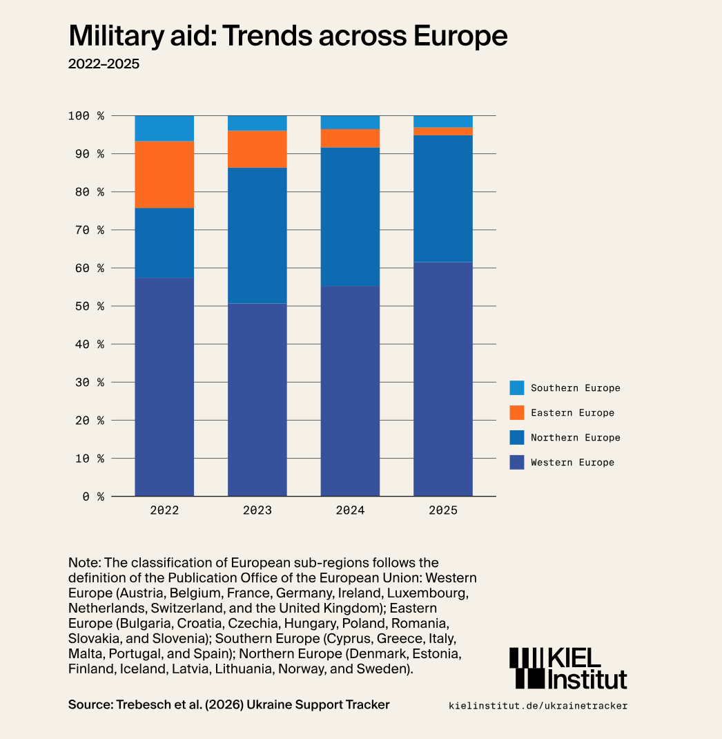L’aumento degli aiuti militari europei nel 2025 si è concentrato soprattutto su un numero limitato di paesi dell’Europa occidentale e settentrionale, sottolinea il rapporto del Kiel Institute. L’Europa occidentale ha registrato una ripresa dopo la flessione del 2023 e ha raggiunto il 62% degli stanziamenti totali per gli aiuti militari europei nel 2025.