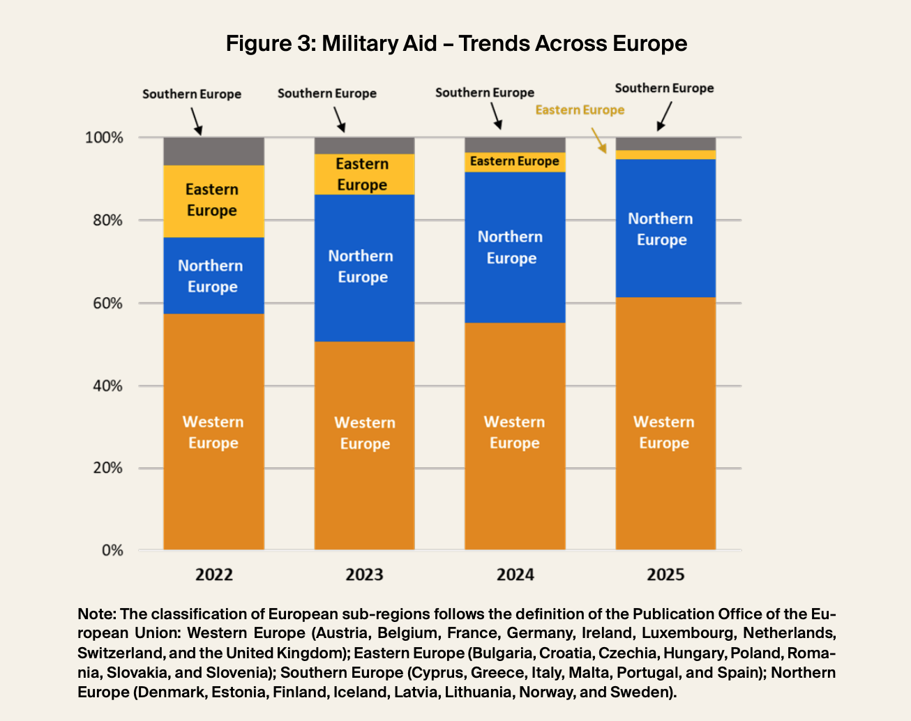 L’Europa settentrionale si conferma come seconda area chiave per la fornitura di aiuti militari. La sua quota è cresciuta dal 18% nel 2022 al 36% nel 2023, mantenendosi poi su livelli elevati anche negli anni successivi.
