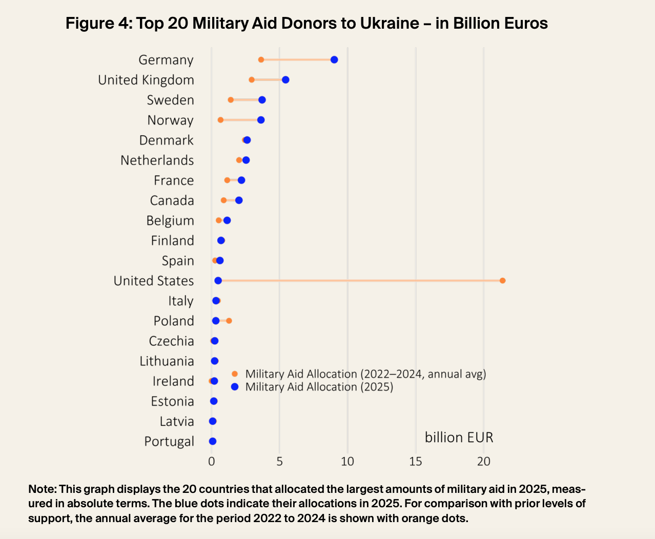 Questa ampia eterogeneità negli aiuti militari tra i donatori è ancora più evidente nella Figura 4 – segnala il rapporto – che mostra gli stanziamenti militari annuali per il 2025, rispetto alle medie annuali del periodo 2022-2024. Germania (9 miliardi di euro) e Regno Unito (5,4 miliardi di euro) hanno registrato gli stanziamenti più elevati per gli aiuti militari nel 2025, seguiti non da altre grandi economie europee, ma da paesi più piccoli del Nord Europa come Svezia (3,7 miliardi di euro), Norvegia (3,6 miliardi di euro) e Danimarca (2,6 miliardi di euro). Germania, Regno Unito, Norvegia e Svezia sono anche i paesi che hanno registrato il maggiore aumento degli aiuti militari nel 2025.